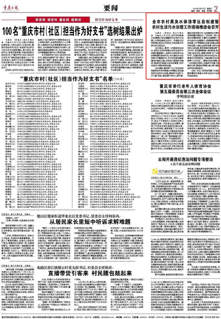 2024年1月17日,《重慶日報》第002版發表了《全市農村黑臭水體清零區縣創建暨農村生活污水治理工作現場推進會召開》。