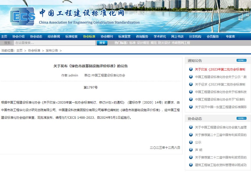 根據中國工程建設標準化協會《關于印發<2020年第一批協會標準制訂、修訂計劃的通知》(建標協字(2020) 14號)的要求,由中國市政工程華北設計研究總院有限公司、中國建設科技集團股份有限公司牽頭,重慶閣林環保科技有限公司等單位參與編制的《綠色市政基礎設施評價標準》,經中國工程建設標準化協會組織審查,現批準發布,編號為T/CECS 1488-2023,自2024年5月1日起施行。