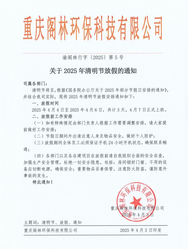 通知公告 渝閣林行字〔2025〕第5號 關于清明節放假的通知 來源/作者:閣林環保 ?? 發布時間:2025-04-03 ?? 瀏覽次數: 上一篇:渝閣林行字〔2025〕第6號 關于鼓勵員工推薦優質外部供應商的通知 渝閣林行字〔2025〕第4號 關于車輛管理制度修訂的通知:下一篇 更多新聞 渝閣林工字〔2025〕第5號 關于考取渝建安C證的通知 渝閣林工字〔2025〕第4號 關于發布《EPC工程事業部崗位職責說明書》的通知 渝閣林財字〔2025〕第1號 關于2025年年終關賬工作有關事項的通知 閣林環保支委發〔2025〕7號 關于組織開展“清水潤心·關愛同行”公益活動的通知