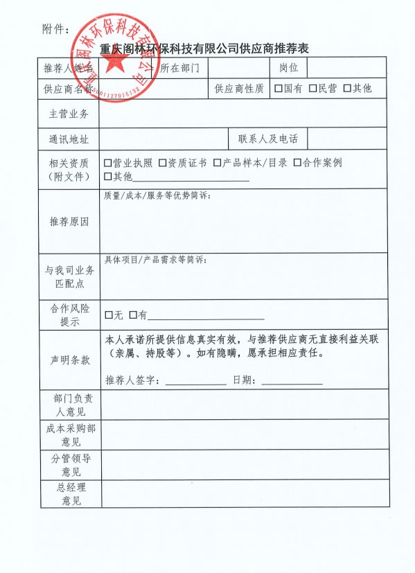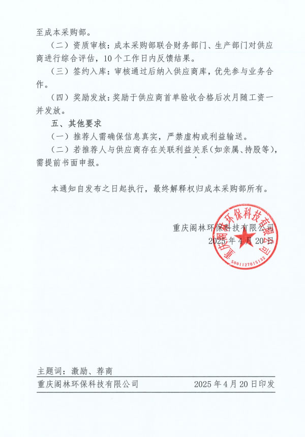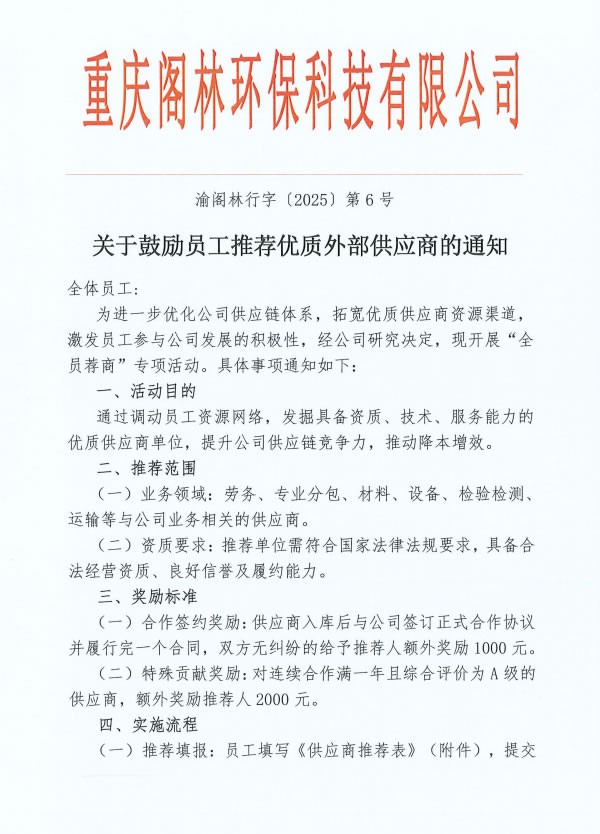 通知公告 渝閣林行字〔2025〕第6號(hào) 關(guān)于鼓勵(lì)員工推薦優(yōu)質(zhì)外部供應(yīng)商的通知 來(lái)源/作者:成本采購(gòu)部 ?? 發(fā)布時(shí)間:2025-04-20 ?? 瀏覽次數(shù): 上一篇:渝閣林行字〔2025〕第7號(hào) 關(guān)于勞動(dòng)節(jié)放假與工作時(shí)間調(diào)整的通知 渝閣林行字〔2025〕第5號(hào) 關(guān)于清明節(jié)放假的通知:下一篇 更多新聞 渝閣林工字〔2025〕第5號(hào) 關(guān)于考取渝建安C證的通知 渝閣林工字〔2025〕第4號(hào) 關(guān)于發(fā)布《EPC工程事業(yè)部崗位職責(zé)說(shuō)明書(shū)》的通知 渝閣林財(cái)字〔2025〕第1號(hào) 關(guān)于2025年年終關(guān)賬工作有關(guān)事項(xiàng)的通知 閣林環(huán)保支委發(fā)〔2025〕7號(hào) 關(guān)于組織開(kāi)展“清水潤(rùn)心·關(guān)愛(ài)同行”公益活動(dòng)的通知