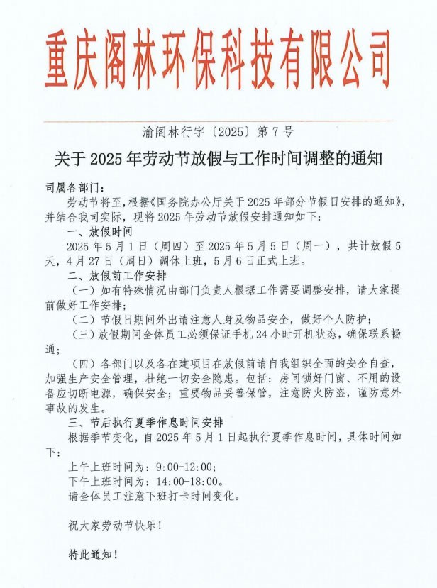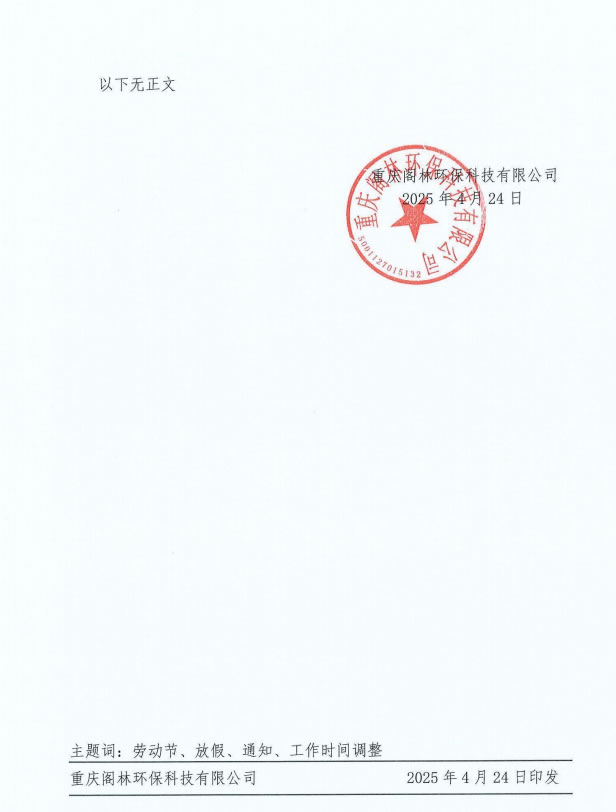 通知公告 渝閣林行字〔2025〕第7號 關(guān)于勞動節(jié)放假與工作時間調(diào)整的通知 來源/作者:閣林環(huán)保 ?? 發(fā)布時間:2025-04-24 ?? 瀏覽次數(shù): 上一篇:渝閣林獎字〔2025〕第1號 關(guān)于對玉環(huán)市干江電鍍園區(qū)污水處理站項目經(jīng)理晏啟波同志等團隊成員予以專項獎勵的通報 渝閣林行字〔2025〕第6號 關(guān)于鼓勵員工推薦優(yōu)質(zhì)外部供應(yīng)商的通知:下一篇 更多新聞 渝閣林工字〔2025〕第5號 關(guān)于考取渝建安C證的通知 渝閣林工字〔2025〕第4號 關(guān)于發(fā)布《EPC工程事業(yè)部崗位職責(zé)說明書》的通知 渝閣林財字〔2025〕第1號 關(guān)于2025年年終關(guān)賬工作有關(guān)事項的通知 閣林環(huán)保支委發(fā)〔2025〕7號 關(guān)于組織開展“清水潤心·關(guān)愛同行”公益活動的通知
