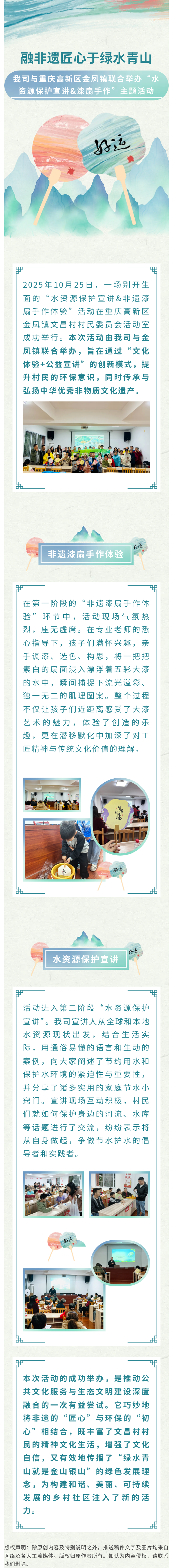 公司要聞媒體報(bào)道行業(yè)動(dòng)態(tài) 融非遺匠心于綠水青山 | 我司與重慶高新區(qū)金鳳鎮(zhèn)聯(lián)合舉辦“水資源保護(hù)宣講&漆扇手作”主題活動(dòng) 來(lái)源/作者:人事行政部 ?? 發(fā)布時(shí)間:2025-10-27 ?? 瀏覽次數(shù): 上一篇:新聞快訊?|?重慶市湖南商會(huì)蒞臨我司考察交流 喜訊 | 以專精之道,潤(rùn)水土生機(jī):我司榮獲國(guó)家級(jí)專精特新“小巨人”企業(yè)榮譽(yù)稱號(hào):下一篇 更多新聞 清水潤(rùn)心·關(guān)愛(ài)同行 | 我司前往桐梓縣高橋鎮(zhèn)青杠村開(kāi)展關(guān)懷留守兒童公益活動(dòng) 新聞快訊?|?芯視界(北京)科技有限公司到訪閣林環(huán)保,攜手重慶大學(xué)環(huán)境與生態(tài)學(xué)院,三方共筑"感知-治理"一體化環(huán)保新生態(tài) 新聞快訊?|?重慶市湖南商會(huì)蒞臨我司考察交流 融非遺匠心于綠水青山 | 我司與重慶高新區(qū)金鳳鎮(zhèn)聯(lián)合舉辦“水資源保護(hù)宣講&漆扇手作”主題活動(dòng)